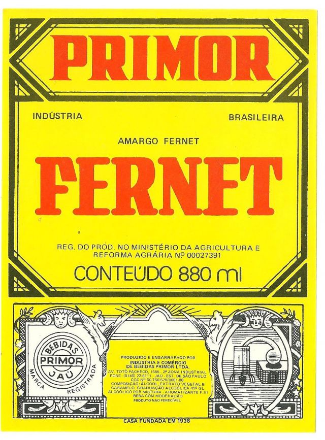 406 - FERNET AMARGO MARCA PRIMOR CONTEÚDO 880 ML DÉCADA DE 80 - RARO (código item:2246) |